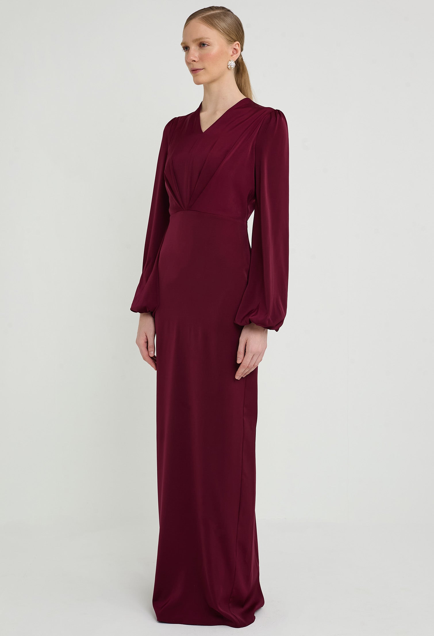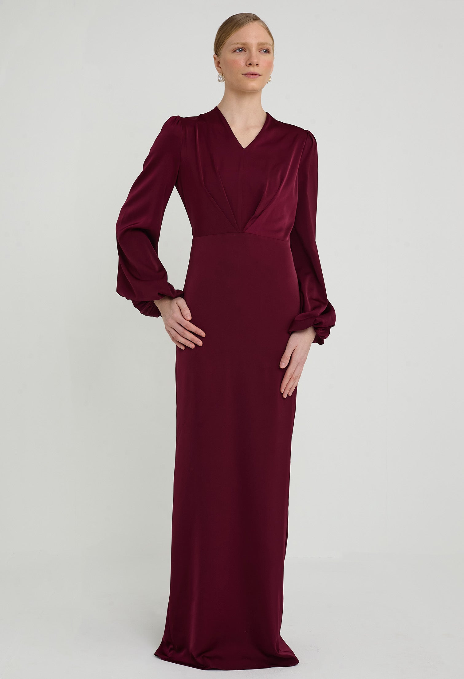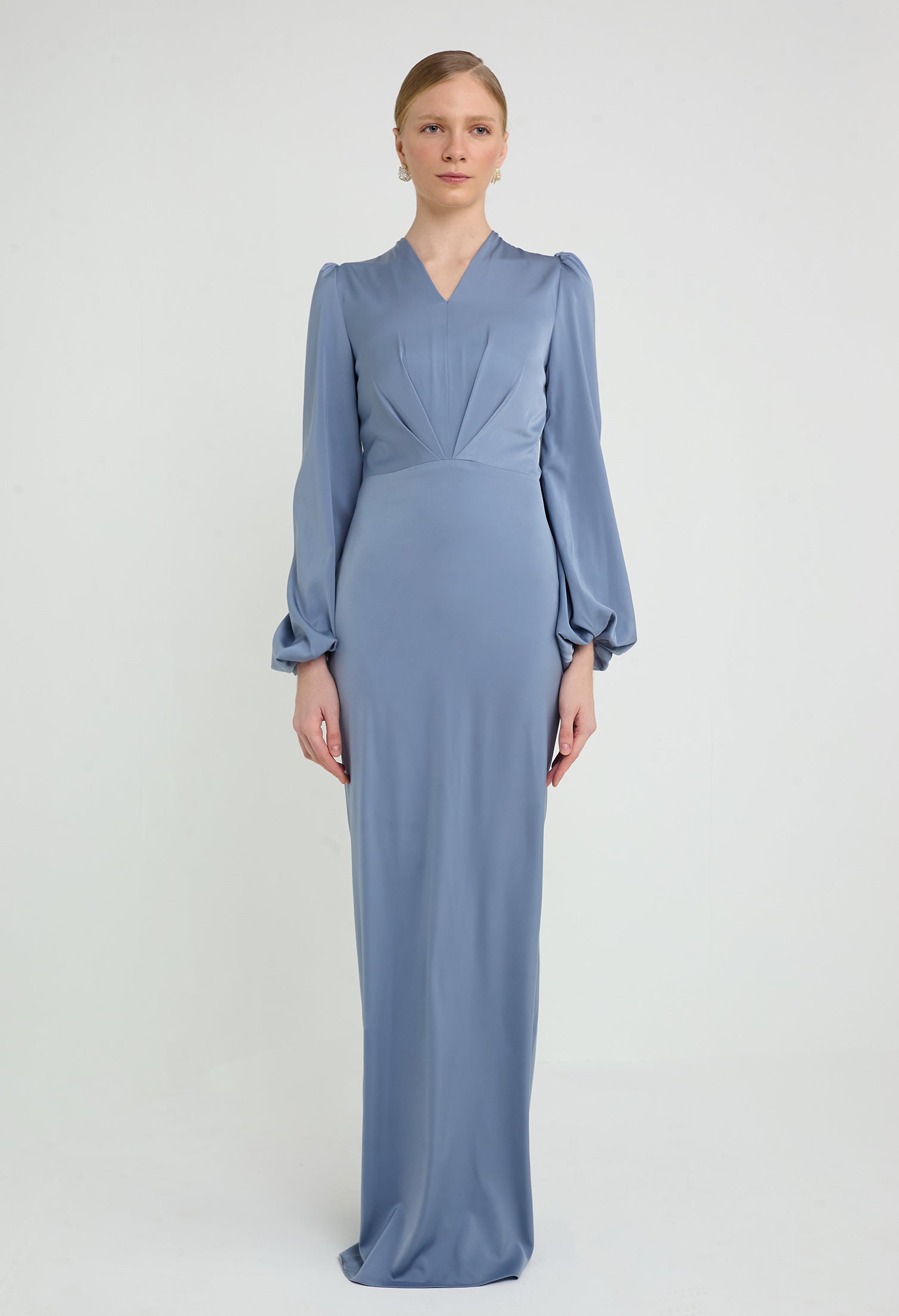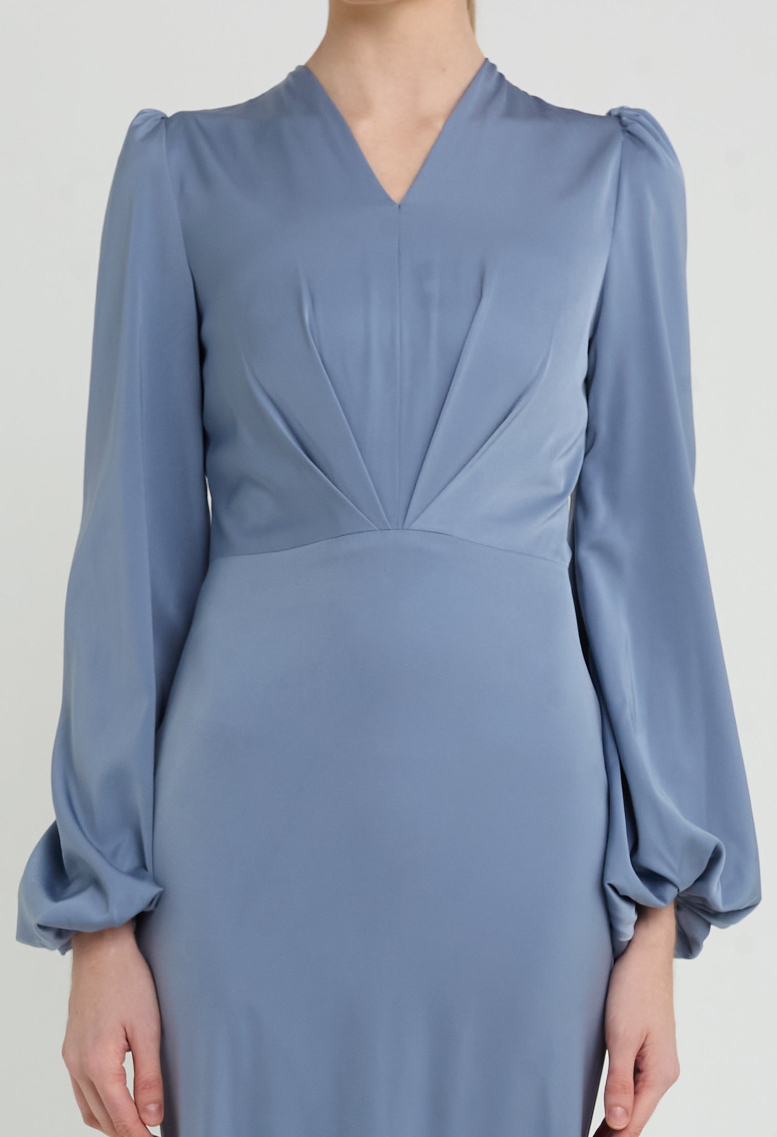 - Inverted V-Pleated Bodice with Bishop Sleeves