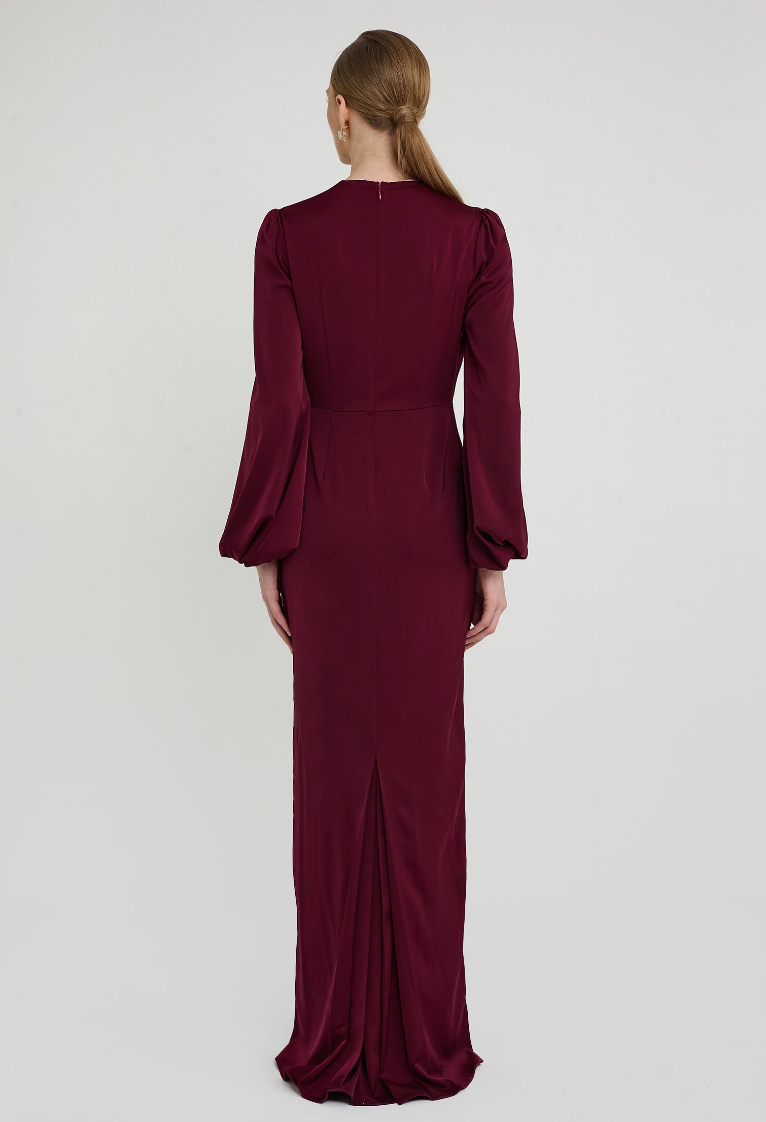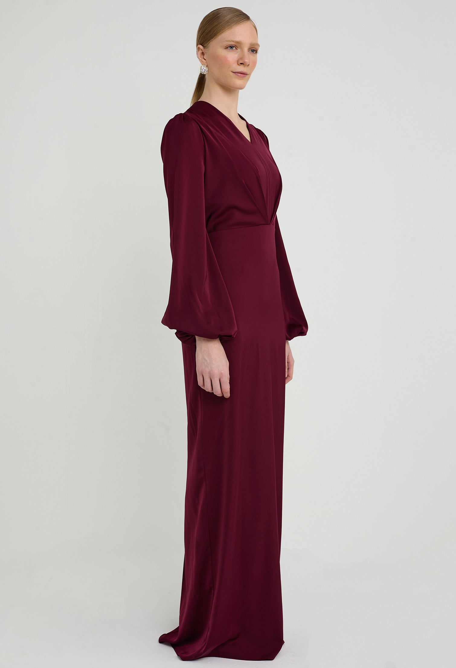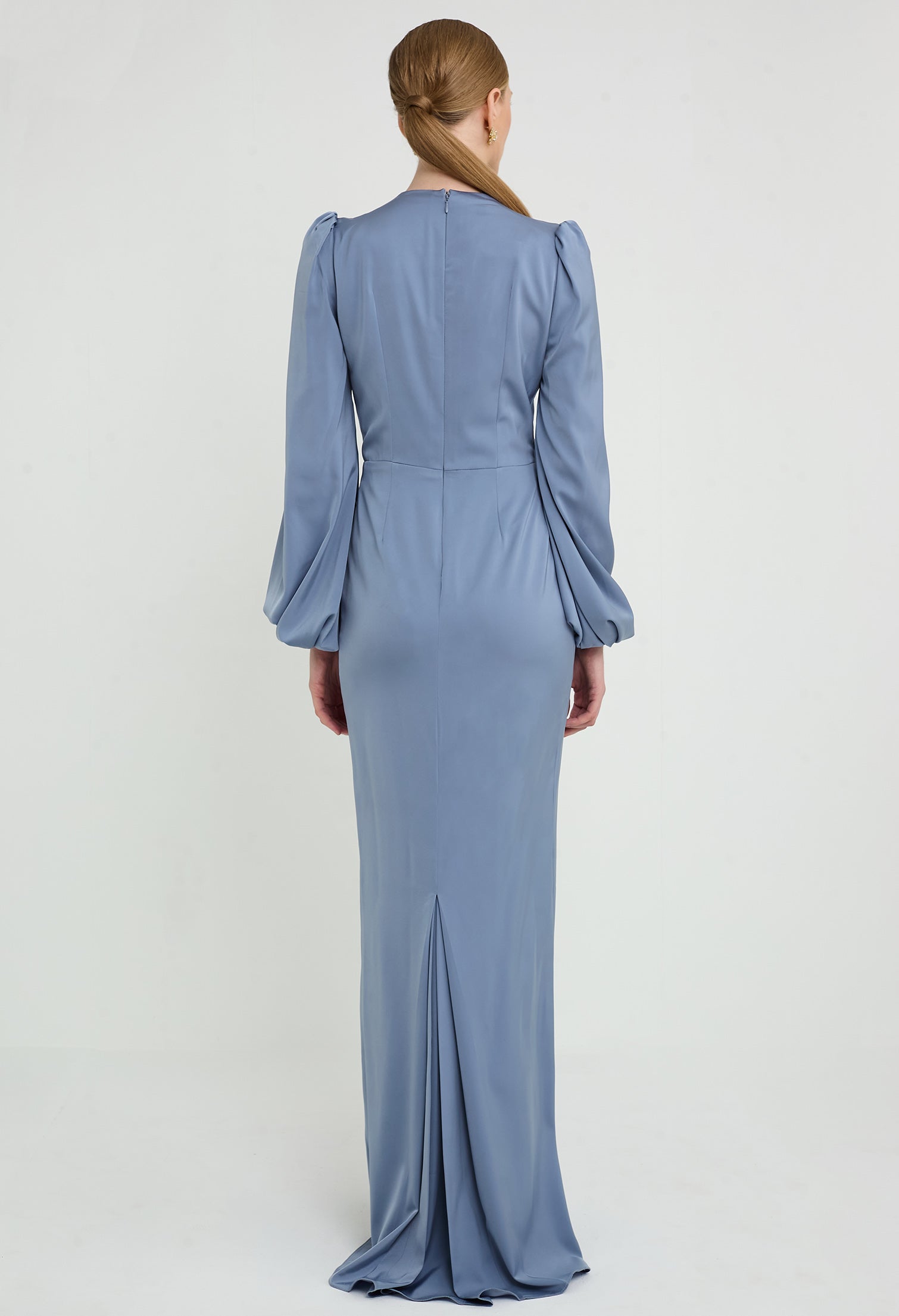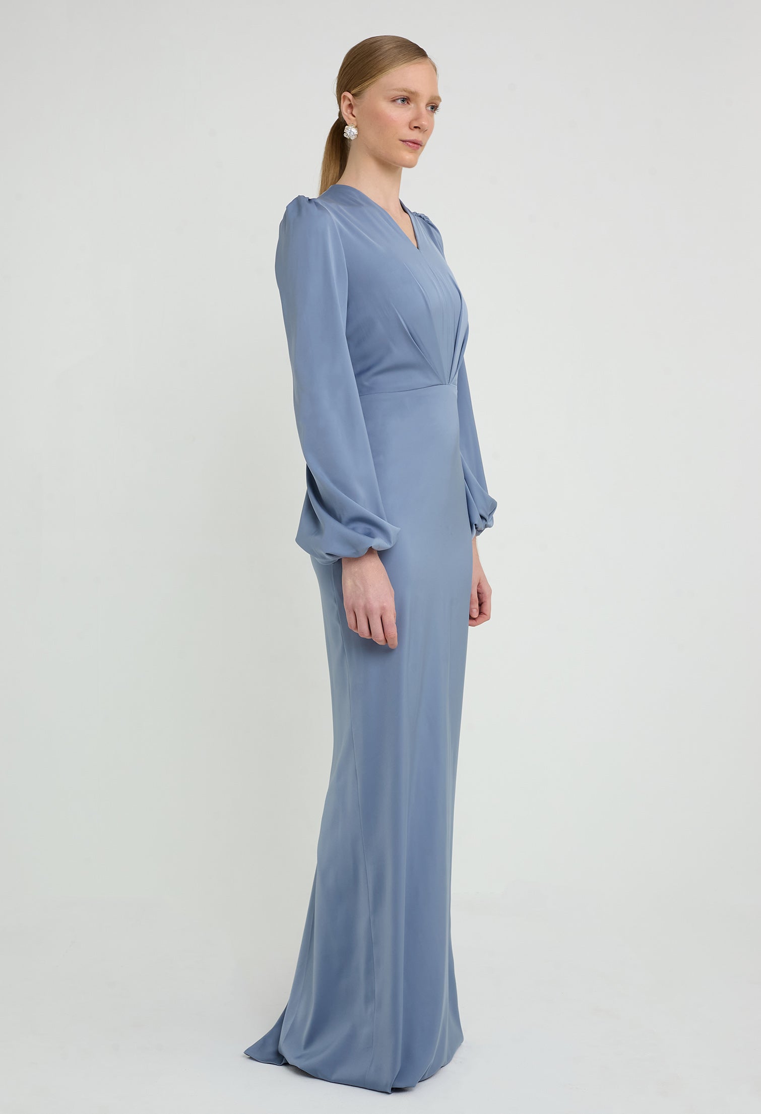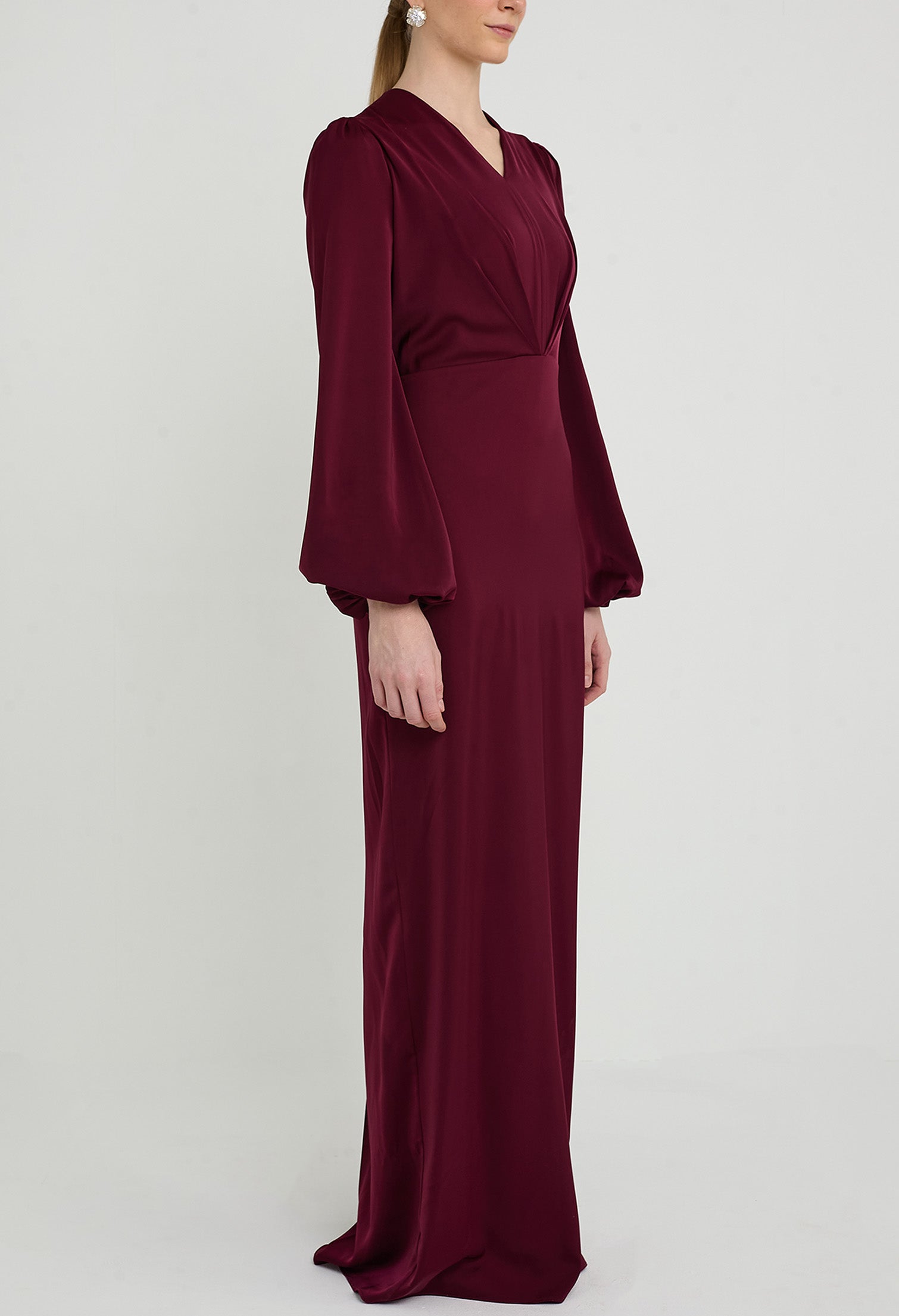 - Inverted V-Pleated Bodice with Bishop Sleeves